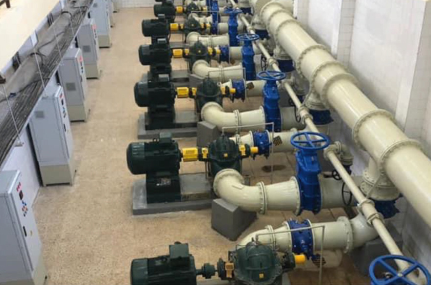 عدد 6 مضخات بعلب مقسمة 600 م³/ساعة، برأس هيدروليكي 20 مترًا والتي تتم تغذيتها بمحرك قدرة 55 كيلوواط