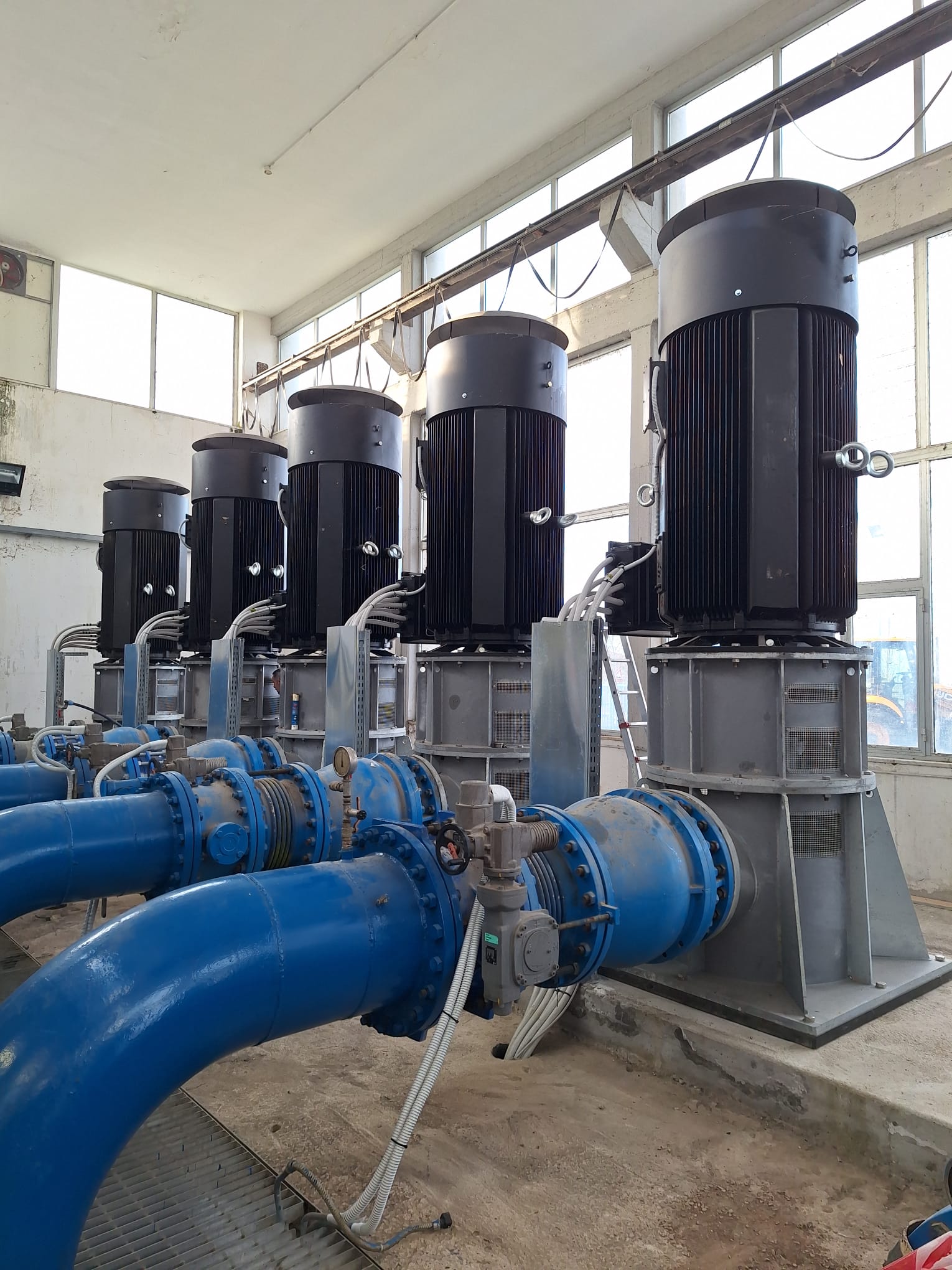 5 customised vertical lineshaft units delivering 700 l/sec with a pressure of 100m. The vertical units are equipped with 850kW, 6-pole motors