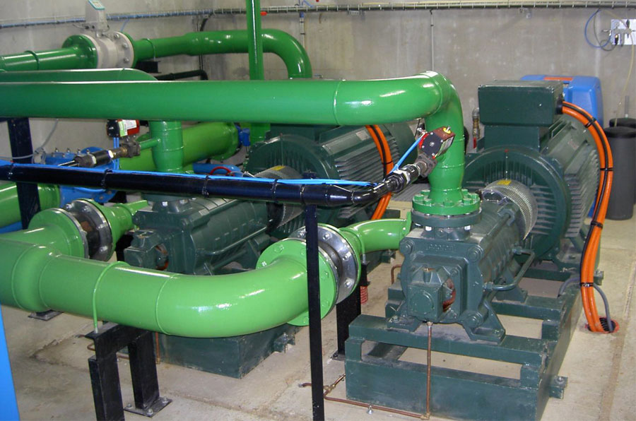 عدد 2 مضخة متعددة المراحل أفقية للضغط العالي من سلسلة PM بمعدل تدفق 150 م3/ساعة وضغط رأس هيدروليكي يصل إلى 400 متر عمود ماء.